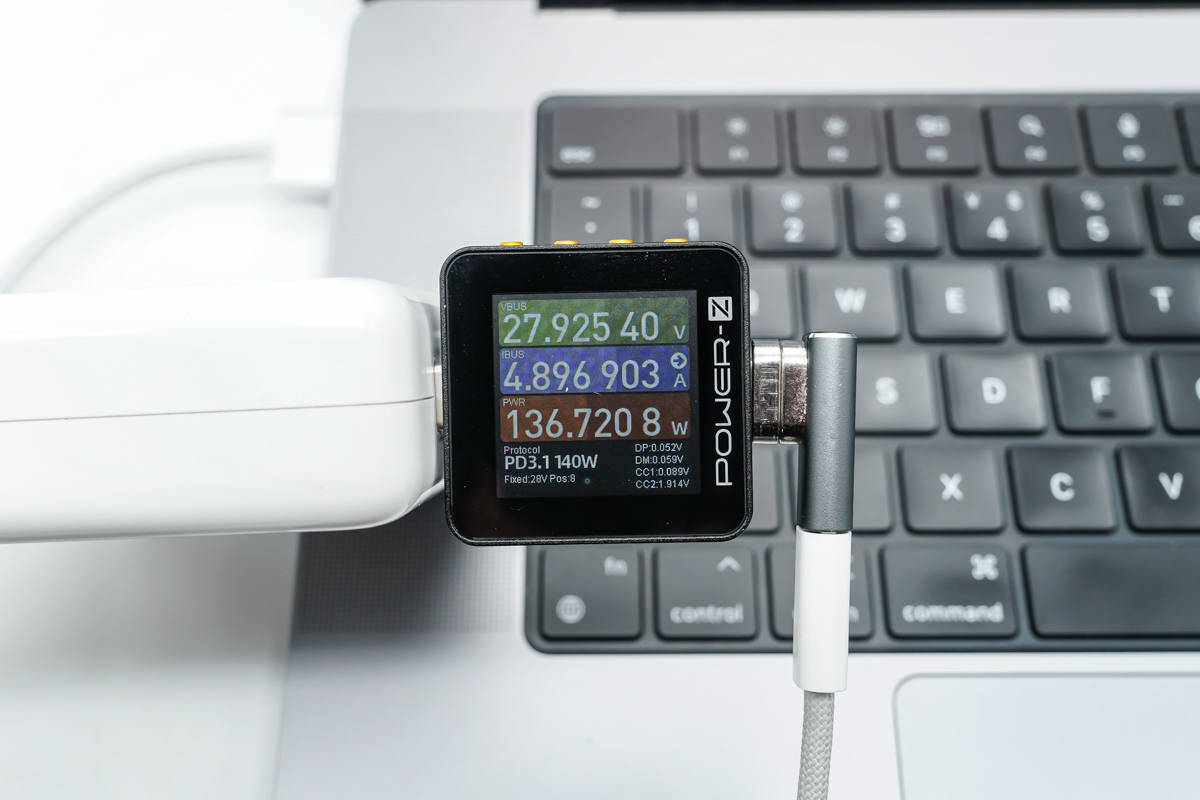Dokonce... také podporuje 140W rychlé nabíjení a adaptér je připojen k 140W gallium nitridové nabíječce Apple a MagSafe 3 rychlonabíjecímu kabelu. V tuto chvíli je nabíjecí napětí 28V a výkon 135,72W.