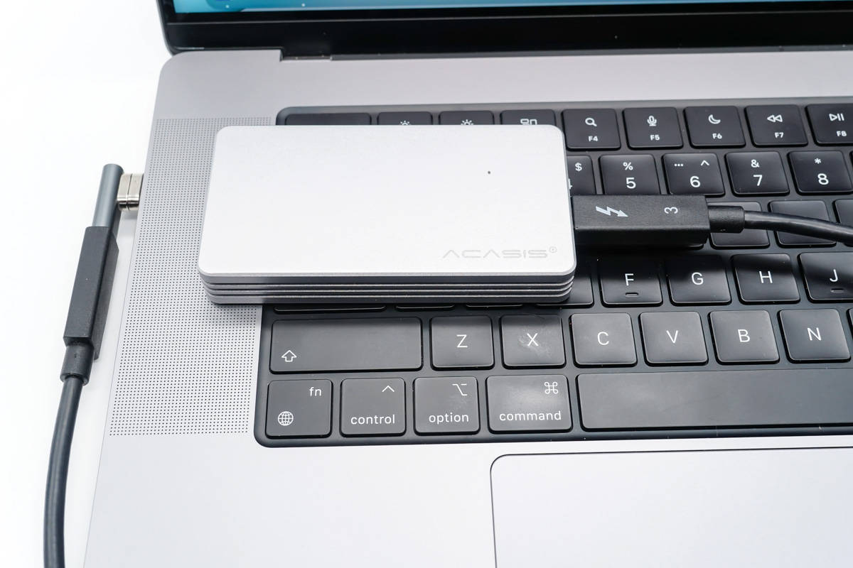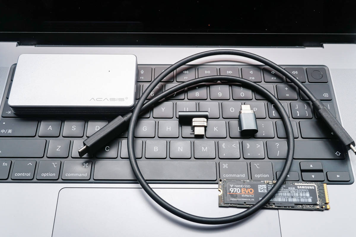 Dále se podívejme na test přenosu dat. Použité nástroje jsou disk SSD Samsung 970 EVO, box pevného disku Thunderbolt 3, datový kabel Thunderbolt 3 a dva adaptéry.