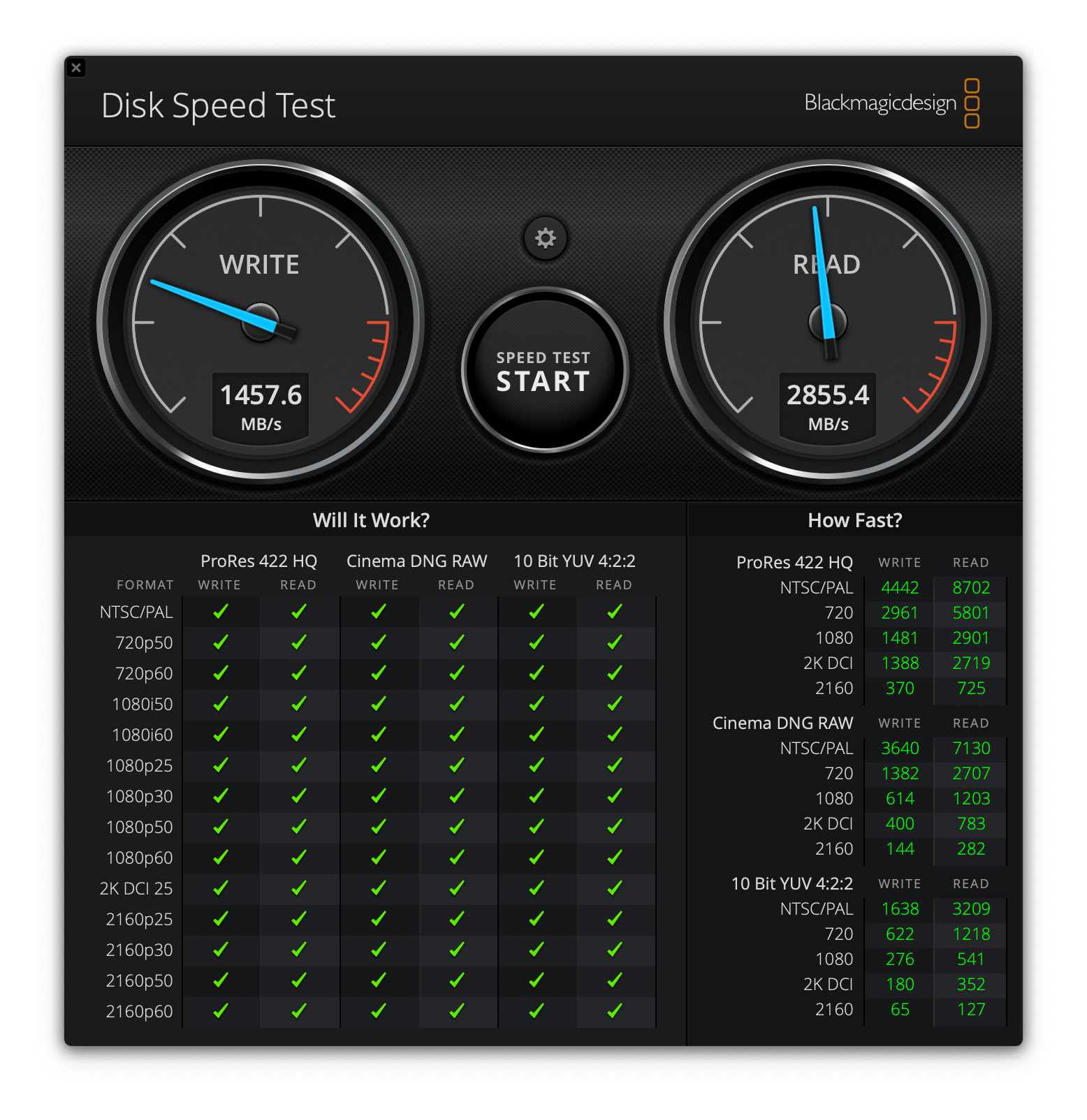 Pomocí testu rychlosti disku na MacBooku Pro otestujte přenosovou rychlost, naměřená rychlost zápisu je 1457,6 MB/s a rychlost čtení 2855,4 MB/s. (Skutečná rychlost zápisu pevného disku Samsung X5 je zde 1700 MB/s a rychlost čtení 2400 MB/s)