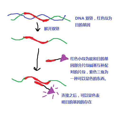 Při vhodném pH, teplotě a iontové síle může DNA sonda vytvořit vodíkovou vazbu s komplementární neznačenou jednořetězcovou DNA nebo RNA ve vzorku, který má být testován, s využitím vysoké přesnosti molekulární denaturace, renaturace a párování komplementárních bází. se spojí za vzniku dvouvláknového komplexu.